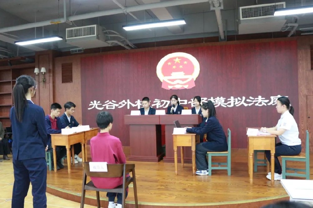 为了让大家身临其境地感受法律的威严,来自光谷外校八年级的9名同学精心准备,通过模拟法庭,再现了一场校园欺凌案的“庭审”过程。4月30日,“模拟法庭”活动在初中部报告厅正式举行。逼真的“法庭”布置、精彩的现场演出,让同学们如临其境,而贴近学生校园生活的“校园欺凌案”,更是激起了同学们的强烈兴趣。部分同学扮演的审判人员和公诉人的发言赢得同学们的阵阵掌声,在同学间产生热烈反响。整个“庭审过程”专业、严肃、有序、完整,获得了在座领导和老师的高度肯定。