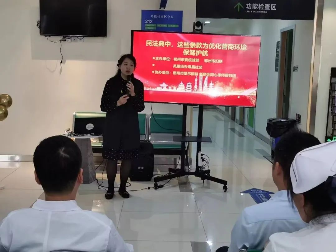 5月11日,鄂州市凤凰街道寿昌社区联合市妇联走进辖区爱尔眼科医院,开展以“民法典中,这些条款为优化营商环境保驾护航”为主题的普法宣传活动。