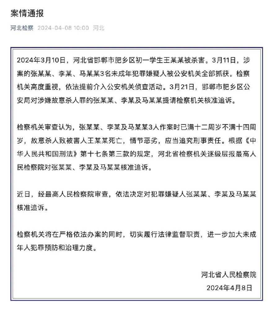 4月8日,广受关注的“河北邯郸初中生被害案”有了最新进展:检察机关审查认为,3名犯罪嫌疑人作案时已满12周岁不满14周岁,故意杀人致被害人死亡,情节恶劣,应当追究刑事责任。目前,**检已依法决定对3人核准追诉。